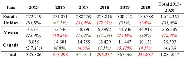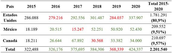 Como puede apreciar el lector en la Tabla 2, Estados Unidos es el principal destino de las exportaciones dentro del T-MEC para el departamento de Santander. El 81,6% de las exportaciones totales de Santander hacia el T-MEC en el periodo 2015-2020 van dirigidas hacia Estados Unidos. Sin embargo, en el año 2020 sufre un importante declive en las exportaciones hacia dicho país en comparación con los años anteriores, teniendo el peor comportamiento en el periodo de estudio con transacciones internacionales por US$ 180.788, presentando una caída del 40% en el año 2020 con respecto al 2019.