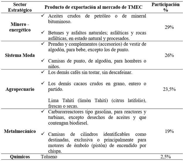 Como se puede apreciar en la Tabla 4, el sector minero energético es el sector con mayor vocación exportadora hacia el acuerdo comercial compuesto por Estados Unidos, México y Canadá con una participación en las exportaciones del 29%. Se destacan en segundo renglón otros sectores que jalonan las exportaciones hacia el T-MEC, como son el sistema moda que aporta el 26% de las exportaciones y el agroindustrial con 23,5%