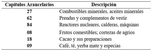 Para realizar este análisis en la Tabla 5, se tomarán en cuenta los resultados del apartado anterior donde se determinaron cuales sectores tenían una mayor participación dentro de las exportaciones de Santander, por lo tanto, los capítulos arancelarios con los que se realizará el estudio del comercio intrarregional serán: