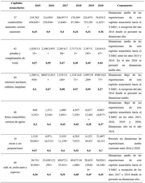 La Tabla 6 muestra la tendencia exportadora del departamento de Santander hacia los mercados del T-MEC fue media en el periodo 2015-2020. Por medio de la aplicación de este indicador, se logró mostrar que el departamento presenta una tendencia exportadora en tres capítulos arancelarios. El primero de ellos es el capítulo 27 (combustibles minerales, aceites minerales), donde se presenta una tendencia exportadora alta en 2016. El segundo capítulo con alta tendencia exportadora fue el capítulo 62 (prendas y complementos de vestir), en los años 2015, 2016 y 2020. El tercer capítulo arancelario fue el correspondiente al capítulo 18 (cacao y sus preparaciones), en los años 2018 y 2020 por el departamento de Santander (DIAN, 2021).