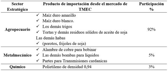 El sector agropecuario es el sector con mayor vocación importadora desde el acuerdo comercial compuesto por Estados Unidos, México y Canadá con una participación en las importaciones del 92%. La dinámica importadora del departamento está liderada por las partidas arancelarias de productos agrícolas. La más importante es la 1005901100 correspondiente a maíz duro amarillo con una participación total del 35% de las transacciones comerciales desde el mercado del T-MEC. Le siguen en importancia las partidas 1001991090 (los demás trigos) con una participación del 22%; la partida 2304000000 (Tortas y demás residuos sólidos de aceite de soja) con una participación del 20%; la partida 1201900000 (las demás habas, porotos, frijoles de soja) con participación del 15% y finalmente la partida 1005901200 Maíz duro blanco con 2,6%.