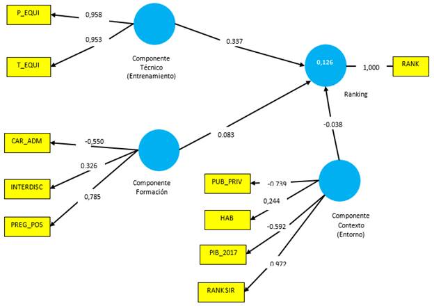 El R cuadrado mide la cantidad de varianza explicada por los constructos, en el caso particular, los constructos Entrenamiento, Formación Académica y Contexto Externo, explican en un 12.6% la variabilidad del Ranking, como se puede ver en la Figura 3.