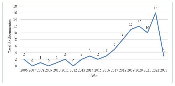 En primer lugar, los documentos seleccionados tienen una periodicidad entre el 2006 y 2023, siendo el 10 de marzo de 2023 la fecha de corte para esta investigación. Es de anotar que este período de tiempo, que no hizo parte de los criterios de inclusión y exclusión anteriormente descritos, corresponde al lapso de años en el que fueron publicadas las investigaciones en las bases de datos consultadas con la utilización de la ecuación de búsqueda que fue definida.