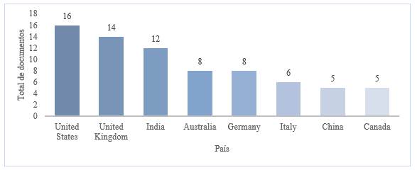 Estados Unidos y Reino Unido son los países con mayor productividad, los cuales registran 16 y 14 documentos, respectivamente. Estos dos países, de acuerdo con lo manifestado por Bacq & Janssen (2011), Granados et al. (2011) y Monteiro et al. (2022), son los que lideran la investigación en este campo. Los siguientes países que más productividad tienen, en orden decreciente, son: India, Australia, Alemania, Italia, China y Canadá. En la Figura 3, se presenta esta información.
