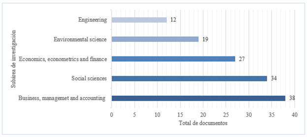 Por otra parte, con la matriz construida en el proceso metodológico, se logró identificar y clasificar la subárea de investigación de los 81 documentos, los cuales corresponden, en orden descendente, a: (i) negocios, gestión y contabilidad, (ii) ciencias sociales, (iii) economía, econometría y finanzas, (iv) ciencias medioambientales e (v) ingeniería. En la Figura 4, se grafican estas subáreas de investigación.