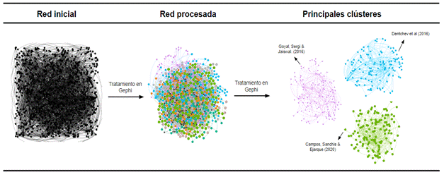 Con el procesamiento del grafo en Gephi fue posible la identificación de las diferentes perspectivas de investigación de esta área de conocimiento. Específicamente, se identificaron 9 perspectivas, sin embargo, 3 de ellas acaparaban el 68,7% del total de la red de co-citación, argumento en el que se sustentó la elección de estos 3 clústeres para su procesamiento y análisis. El procesamiento de la red de co-citación se ilustra en la Figura 6, mientras que las tres principales perspectivas se describen a continuación.