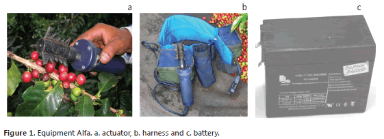 Equipment description. The equipment designed and used in the evaluations, called Alfa, is portable and designed to detach fruits in the glomeruli, individually or severally. The Alfa tool is integrated by an actuator and a harness. The actuator employs a beater with toothed-blades (Moreno et al., 2013) and a direct current electric engine of 15W and 160 g to detach mature fruits. Two dry batteries of 12 V and 2.2 A, placed in the harness supported at the waist of the operator, are used to drive the equipment (Figure 1). The harness weight is 3.6 kg and the detached fruits are collected with a tray.