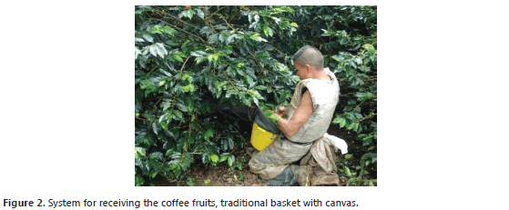 Pueblo Bello substation. The evaluation was conducted in lots with Colombia variety coffee trees, second and third harvest, planted at 1.5 x 1.5 m, steep topography, with the presence of rocks and slopes of up to 80%. The harvest included two operators; each was given an Alfa device and basket with canvas to receive the fruit detached by the device (Oliveros et al., 2008) consisting of a conventional basket and a canvas attached to its top that was extended and secured to the stalk of the harvested tree (Figure 2). Before starting the tests, the two operators formed a harvesting pair and received an orientation of 15 min for the Alfa device and traditional baskets with canvas. They then harvested for one day in order to become familiar with the technology. The two collectors were simultaneously positioned, one on each side of the harvested tree. For the first harvest day with the Alfa device, an incentive of $US 0.52 cents per kilogram of collected coffee was paid to promote its use.
