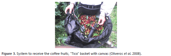 The harvest and postharvest of coffee represent up to 50% of total production costs (FEDERACAFÉ, 2012). The Federación Nacional de Cafeteros de Colombia has been promoting a strategy to implement a research program for coffee harvests through the National Coffee Research Center, Cenicafé, whose purpose is to contribute to the improvement of this activity as a whole and, therefore, to the sustainability of the coffee industry. A time and motion study in manual harvesting was the first research developed by Cenicafé; this study detected some movements that are part of the harvest cycle but which do not contribute to the yield and, therefore, should be eliminated; this study motivated the development of a new harvesting method which was called "improved hand-picking method" (Vélez et al., 1999; Vélez et al., 2002; Martínez et al., 2005). Similarly, others studies have been carried out with the purpose of adapting and evaluating the commercial equipment used in other countries to harvesting coffee and other products such as olives; for example, (Oliveros, 1999; García, 2001 and García et al., 2001) modified and evaluated a device to harvest coffee cherries by beating the branches, reporting yields of up to 36.1 kg h-1, detached mature fruits between 83% and 92.3% and green fruits in the harvested coffee between 38.3% and 4.3%. Díaz et al. (2009) evaluated the semi-mechanized coffee harvesting device: STIHL SP-81 at two locations in Colombia with the varieties Caturra and Colombia, helping to reduce the unit harvest cost by 41.4%, increasing the yield of operators by 102.5%, and with 11.5% to 15.8% of green fruits in the harvested mass (GHM), meaning that many green fruits must be removed to produce high quality coffee.