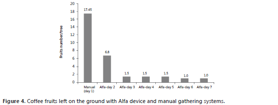 Losses. Figure 4 presents the losses due to fruit left on the ground with the two harvest methods. With hand-picking, the results were consistent with those reported in previous evaluations, surpassing the recommended values for proper management of the coffee bean borer. Notably, most of the fruits found on the ground after manual collection were not mature but green, probably discarded during harvesting. With the Alfa device, in the first day alone, losses exceeded the recommended values, due to the operators' unfamiliarity with the trays. In the following days, the collectors became accustomed to the equipment and, after the second day, losses fell below the maximum values recommended for control of the coffee bean borer (Bustillo, 2002) and even values similar to those reported for coffee harvesting with mesh on the ground were attained (Oliveros et al., 2006).