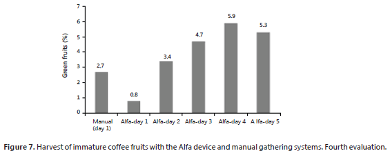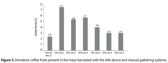 Harvested immature coffee. The results in percentage of harvested green fruits showed that the traditional manual collection complied with the recommendations for maintaining coffee quality (value less than 2.5%; Puerta, 2000). The first day of collection with the Alfa device had the highest amount of detached immature coffee, exceeding the recommended maximums; this was due to three factors: the amount of mature coffee available on the trees, the payment (after the first day, the activity was paid by kg, so they needed to work very fast in order to not lower their harvest yield when the new equipment was used) and the available amount of time for the acquisition of skills and abilities with the new harvest system (although the use of the tool is easily understood by collectors, this represents a strong variation compared to the traditional way of harvesting).
