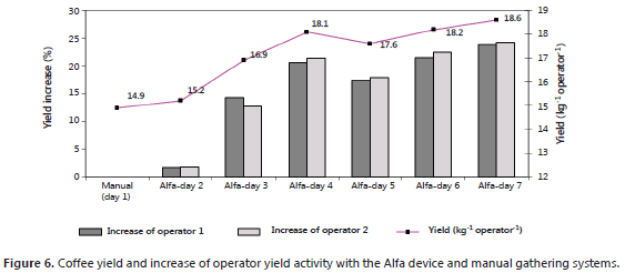 Figure 5 shows the favorable change in percentage of harvested immature coffee with the Alfa device over the course of the workdays. With time, the collectors developed greater skills in handling the equipment, generating greater confidence in its use. From the second day of work, the percentages of immature coffee lowered, reaching values very close to the recommended maximum.