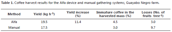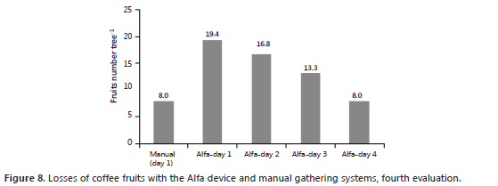 The average percentage of harvested immature coffee for both systems exceeded the maximum recommended value (2.5%; Puerta, 2000). The Alfa device result was slightly higher than for the manual method, similar to that obtained in the first evaluation in spite of having a greater supply of mature coffee in the trees. Losses were lower for the Alfa device than for the manual system (Table 1).