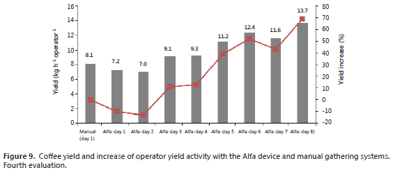 The average amount of ripe coffee for the three lots was 1283 g, very close to that recorded in the second evaluation and remarkably high for the area. However, the average yield for the six pickers using the traditional manual method was the lowest recorded in the four evaluations. The yield for the first two days of harvest with the Alfa device was below the value recorded for manual collection, due to the learning curve for the new harvest system by the collectors; a situation that was seen in all the evaluations. Starting with the third day, the collectors were able to gradually increase yield when using the Alfa device, even reaching a value of 69% for the last day, the peak for the entire study (Figure 9); this coincides with a greater understanding and control of the equipment by the operators.