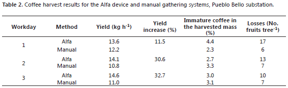 Pueblo Bello substation. The average amount of ripe coffee per site was 1100 g, similar to that presented in the second evaluation, a common amount in the northern Colombia coffee region at harvest time. The average yield with the Alfa device and manual system was less than the first and second evaluations, largely due to the difficult topography of the lot which limited the working capacity of the collectors (presence of rocks and 80% slopes). However, the maximum increase in yield at harvest with the Alfa device with respect to the manual system was superior to that achieved in the previous evaluations (32.7%). After the first day of work, the quantity of harvested immature coffee in the harvested coffee was very similar in both gathering systems and slightly higher than the recommended maximum (Puerta, 2000). For the number of fruits left on the ground after harvest, the situation was different; in this case, the harvest for both the Alfa device and the manual method had values far above the recommended maximums (Bustillo, 2002), occasioned in the Alfa device by the difficulties experienced by the pairs when locating the canvas of the baskets under the tree foliage (Table 2).