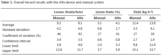Yield. The performance with the Alpha device was greater than the obtained with the manual, but lower than the one reported by Oliveros et al. (2005) with similar equipment designed to detach fruits acting at glomerulus and plastic mesh beneath the trees to collect the detached fruits.