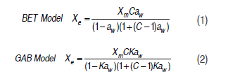 where Xe corresponds to the equilibrium water content, Xm is the monolayer water content, C corresponds to the constants of the BET and GAB models, K is a constant for the GAB model and aw is the water activity. The best fit was defined by the highest value of R2 and the lowest values of X2 and ERMS (Demir et al., 2004; Goyal et al., 2006; Ayala, 2011).