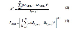 In these expressions, MR,exp,i and MR,exp,i are the calculated and experimental values for each sorption model, N corresponds to the number of experimental data and z is the number of constants for each model.
