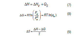 Equation (5) was used to find the thermodynamic properties (Clausius-Clapeyron equation) for the liquid vapor equilibrium at the experimental temperature and pressure (Yan et al., 2008; Bell and Labuza, 2000). With this equation, it was possible to calculate the change in enthalpy for the different moisture levels associated with the sorption processes. The water vapor partial pressure was determined by the following equations: