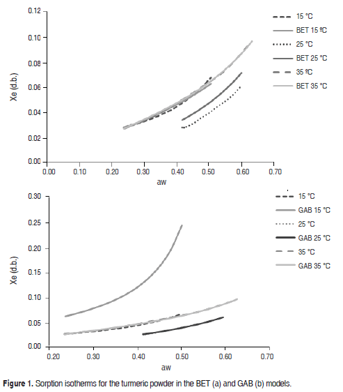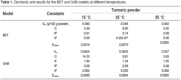 To define the sorption isotherms, the gravimetric method was used. Powder samples of 2 g were placed in triplicate in an Aqualab VSA1020 Decagon, with relative humidity varying from 10 to 90% at temperatures of 15, 25 and 35 °C. The experimental data were fitted to Brunauer, Emmett and Teller (BET) and Guggenhein, Anderson and de Boer models (GAB).The following equations were used to represent the two models (Figueira et al., 2004; Furmaniak et al., 2007; Sinija and Mishra, 2008; Ceballos et al., 2009; Perdomo et al., 2009; Ayala, 2011; Djendoubi et al., 2012):