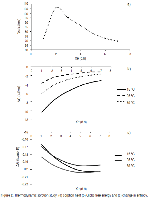 The GAB model provided information on the monolayer water content (Xm), showing that water was strongly absorbed at the active sites on the surface of the food, which relates to suitable storage conditions for low-moisture products (Cano et al., 2013). For the turmeric powder, the Xm value varied between 3.70 and 4.25 g/100 g powder, similar to the findings of Cano et al., (2013) for spray-dried mango powder and Al-Muhtaseb et al. (2004a) for starch powder. The value of the Guggenheim constant (C) indicated the relationship between the sorption heat of the monolayer molecules and temperature. (Here, this value varied indiscriminately with temperature.) The value of the constant K related the sorption heat in the multilayer molecules to the temperature increase from 15 to 25 ºC, which was very similar between 25 and 35 °C; this behavior was also reported by Sharma et al. (2009). Figure 2 shows the sorption thermodynamics of the dried product, where Figure 2(a) contains the net sorption heat value (Qs) that corresponded to the sorption isosteric heat, which described the interaction between the water and product components. There is an increase from 72,480 to 105,630 J/mol for water content between 1 and 2 g/100 g turmeric powder dry basis (d.b.). A decrease from 94,930 to 69,520 J/mol for water content between 3 and 7 g/100 g turmeric powder (d.b.) was observed. The maximum value was achieved with a moisture value close to 2 g/100 g turmeric powder (d.b.). The increase of the sorption isosteric heat in low water contents could be explained by an elevated solid-vapor interaction in the active sites of the product surface, while the sorption heat decreased with an increase in the moisture; the water occupied fewer active sites, decreasing the interaction of the existing kinetic energy between the water molecules and the powder product. A similar behavior was observed by Ayala (2011) and Martínez et al. (2014).
