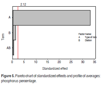 As in the observations made for the calcium, the Pareto chart of standardized effects showed the phosphorus to be a response variable that was only significantly affected by the type of milk factor and the interaction: type of milk and season factor did not significantly affect the concentration of the mineral as indicated by the statistical analysis.