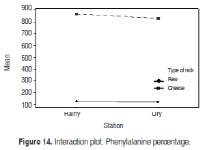 The Methionine tended (slightly significant) to increase in the dry period; however, this situation was not considered statistically significant so it is possible to regard it as having had a constant observation in the two seasons (Figure 17). In the slopes observed in the interaction graph for both the cheese level and the season factor, as well as for the raw milk level, there are parallel lines, which indicate that the interaction between the two cannot be given as shown in Figure 18. There was a slight trend for the data to take higher values in the dry period level (Figure 18).
