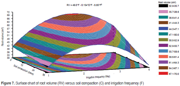 The function RL = f(F, C) was constructed of both irrigation frequencies (F) and compaction levels (C). A table with nine columns created with sixteen (16) average values of the following terms: RL, F, C, F*C, F2, C2, F*C2, F2*C, F2*C2. Multiple Regression with dependent variable RL, independent variables F, C, FC, F2, C2, FC2, F2C, F2C2 applying stepwise regression method: backward selection with 0.05 P-to-enter and 0.05 P-to-remove, provided: R2 = 98.8%, R2 (adjusted for degree of freedom) = 98.3%, Standard error of estimate = 9.5, Mean absolute error = 6.23, Durbin-Watson statistic = 2.05 and a Lag 1 residual auto correlation = -0.0623. The P-value in the ANOVA table was lesser than 0.05; then, the variables at the 95% confidence level were statistically significant. The R2 model statistic indicates, as fitted, explains 98.8% of the variability in RL column.