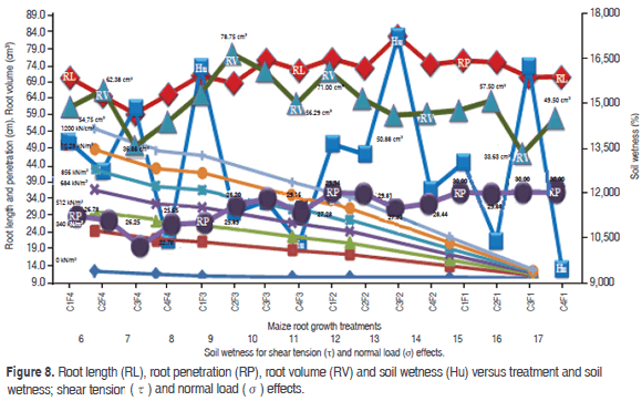 Figure 8 shows the dependent variable root length (RL) and root penetration (RP) affected by experimental treatments and soil wetness (Hu); and, their relations with shear tension and normal loading (sketched according to table 9). RL, RP and (Hu) plotted versus treatments. RL and RP reached similar variations. Treatments, basically, did not influence the dependent variables root length, root penetration and root volume. The means were not significantly different.