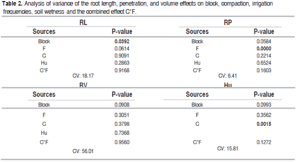 No significance difference arose that the dependent variables root length, root penetration and root volume about the independent variables studied. Slight variability observations of higher values of irrigation frequency interday (2) and every two days (3), with compaction between 0 blows and 12 blows with no significance difference.