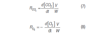 Where RO2 and RCO2 are the respiration rates (mL kg-1 h-1), [O2] and [CO2] are oxygen and carbon dioxide concentrations, t is time (h), Δt is the time between the two measures of the respective gas, V is the free volume in the respiration chamber (mL), and W is the cut fruit mass (kg).