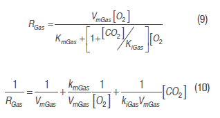 To obtain the cut mango respiration rate in the described conditions, a model based on Michaelis-Menten's kinetic equation was used, using enzymatic kinetic noncompetitive inhibition principles, where CO2 is supposed to react to an enzyme-substrate complex (Artés-Hernández et al., 2010; Ravindra and Goswami, 2008; Bhande et al., 2008). Equation (9) expresses this mechanism for the respiration process in terms of O2 consumption and CO2 production rate. This kind of model presented a significant adjustment in the calculation of mango (Ravindra and Goswami, 2008), banana (Bhande et al., 2008), pepper (Artés-Hernández et al., 2010) and other fruit (Fonseca et al., 2002) respiratory activity.