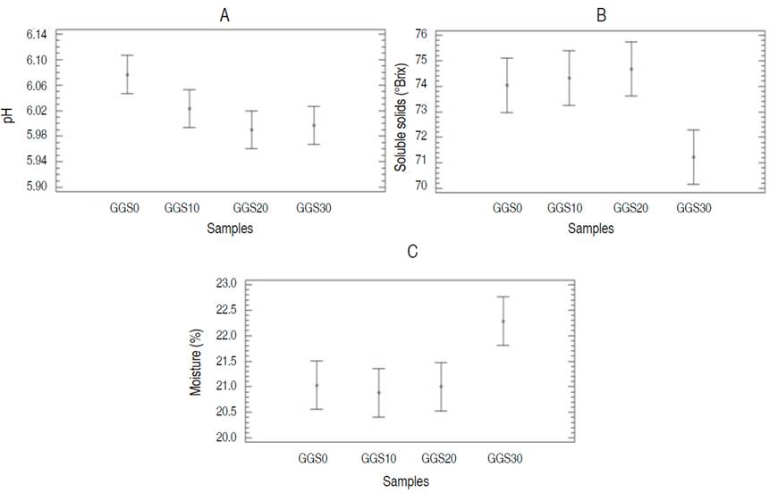The moisture content was similar for 10 and 20% of GGS inclusion, whereas, for 30%, there was significantly different (P<0.05). This change is due to the process was stopped at lower soluble solids because it achieved the appropriate texture at a shorter evaporation time. Since the evaporation time was shorter than the other treatments, more water remained inside the product. The moisture content was close to the defined in the Colombian technical standard NTC 3757. Also, these values coincided with the reported by Andrade et al. (2009), where values of 22% of moisture content for a milk caramel spread from buffalo milk were found.