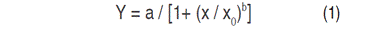 where: Y=grain yield; a=maximum yield obtained in the clean control; x=number of days after crop emergence; x0=number of days in which 50% of maximum yield reduction occurred; and b=curve slope.