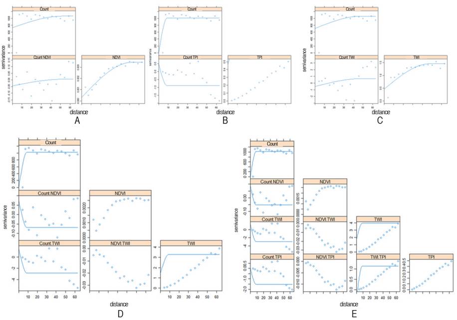 Figure 4 Linear model of co-regionalization models of count Oligonychus sp., A. NDVI; B. TWI; C. TPI; D. NDVI/TWI and E. NDVI/TWI/TPI.