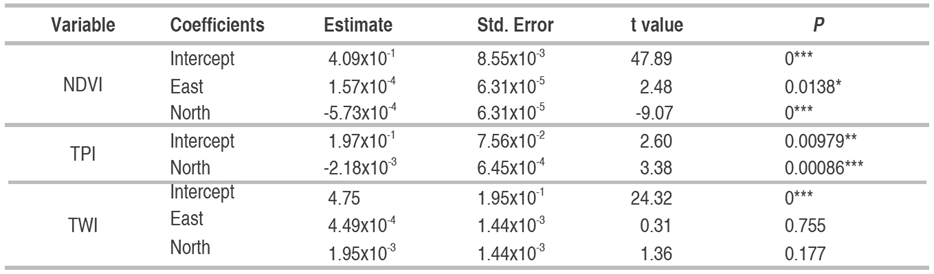 Two questions arise from these results, which are addressed in the following sections: 1) Which indicator function is the closest to reality? and 2) What is the influence of the covariates used in the prediction? To answer these questions, the starting point was the characterization of the spatial statistical process of the NDVI, TWI and TPI and, secondly, the co-regionalization model. The NDVI and DEM show a clearly non-stationary process by means, so it was necessary to extract the trend for the multigaussian conditional simulation process (Table 2). Additionally, the TPI shows a clear first order gradient, but the TWI does not show a gradient.