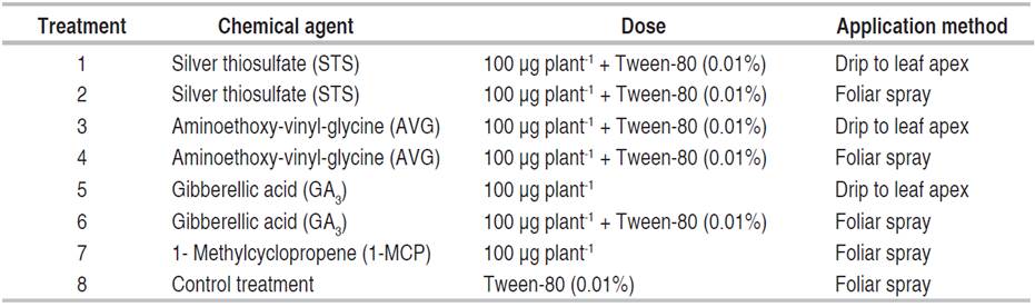 A completely randomized design with eight treatments and four repetitions was used. The treatments consisted of protocols for the sexual reversion of female plants through apex drip and foliar spraying of Silver Thiosulfate (STS), Aminoethoxy-vinyl-glycine (AVG), 1-Methylcyclopropene (1-MCP), and Gibberellic acid (AG3), plus a control treatment without application. Each compound was prepared separately and diluted in demineralized water plus Tween-80 (0.01%) as a surfactant (Table 1).