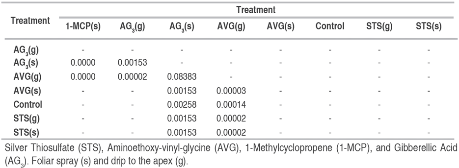 After applying the sexual reversal treatments, a variation in plant height was observed between the moment of flower induction and the end of the experiment. The height data analyzed under the non-parametric Kruskal-Wallis' test showed differences between treatments (chi-squared=80.288, df=7, P-value=1.203x10-14). The Wilcoxon signed-rank test shows a difference between all the treatments and the gibberellic acid treatment for this variable -AG3(g) and AG3(s), and even between these two treatments (Table 3).