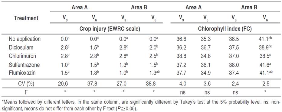 Table 2 Crop injury and total chlorophyll index of soybean plants under application of herbicides in pre-emergence (experiment 1).