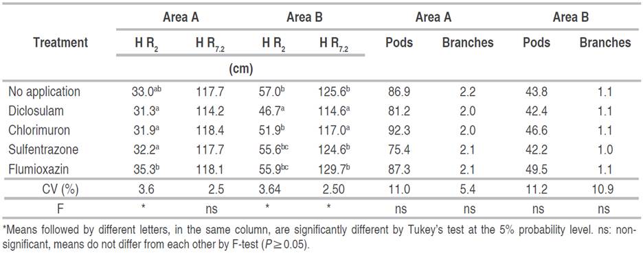 Table 3 Height (H), number of pods and branches of soybean plants under application of herbicides in pre-emergence (experiment 1).