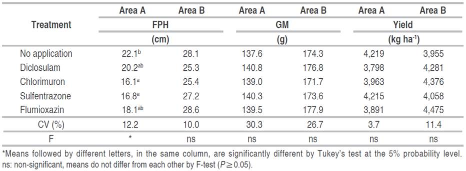 Table 4 First pod height (FPH), 1,000-grain mass (GM), and yield of soybean plants under application of herbicides in pre-emergence (experiment 1).
