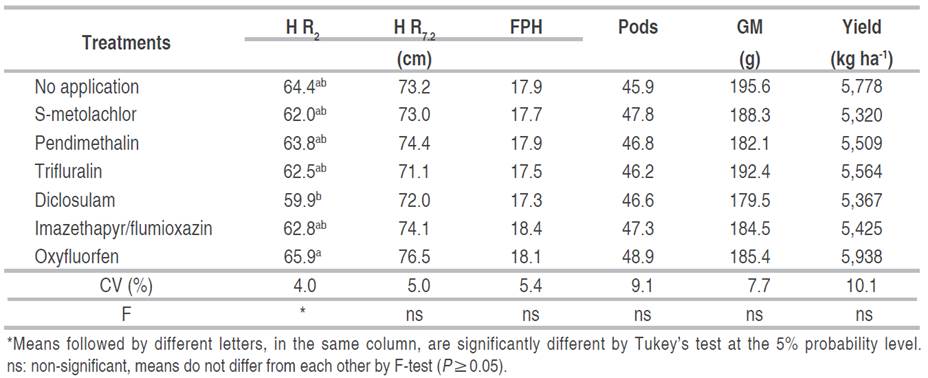 Table 5 Height (H), first pod height (FPH), number of pods, 1,000-grain mass (GM), and yield of soybean plants under application of herbicides in pre-emergence (experiment 2).