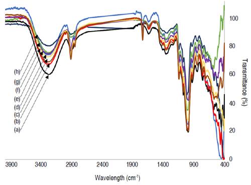 Figure 1 FT-IR spectra of MOECPs. (a) Sample 1 (100 °C), (b) Sample 2 (120 °C), (c) Sample 3 (140 °C), (d) Sample 4 (160 °C), (e) Sample 5 (100 °C), (f) Sample 6 (120 °C), (g) Sample 7 (140 °C), (h) Sample 8 (160 °C). MOECP: Microencapsulated oily extract of Colombian propolis.