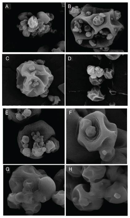 Figure 3 MOECP microparticles at 10 µm magnification. A) Sample 1 (100 °C), B) Sample 2 (120 °C), C) Sample 3 (140 °C), D) Sample 4 (160 °C), E) Sample 5 (100 °C), F) Sample 6 (120 °C), G) Sample 7 (140 °C), H) Sample 8 (160 °C). MOECP: Microencapsulated oily extract of Colombian propolis.