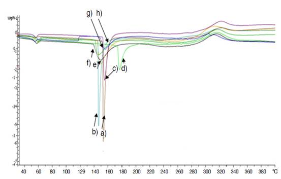 Figure 4 DSC spectra of the MOECPs. a) Light Blue: Sample 1 (100 °C), b) Brown: Sample 2 (120 °C), c) Purple: Sample 3 (140 °C), d) Light Green: Sample 4 (160 °C), e) Yellow Ochre: Sample 5 (100 °C), f) Black: Sample 6 (120 °C), g) Dark Green: Sample 7 (140 °C), h) Dark Blue: Sample 8 (160 °C). MOECP: Microencapsulated oily extract of Colombian propolis.