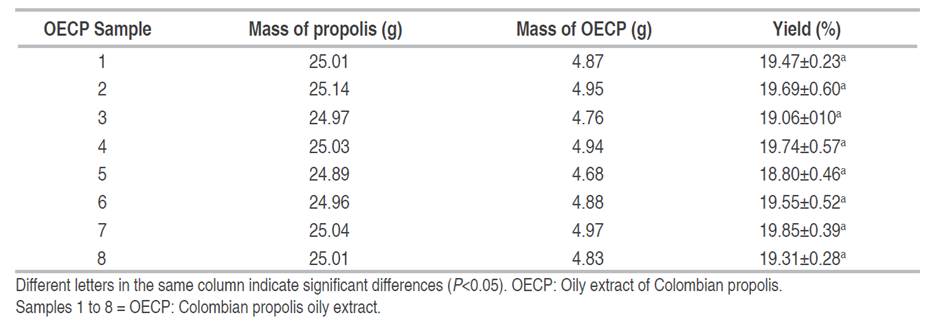 The propolis used in this study were selected because it inhibits coliform microorganisms. Extraction was carried out on eight samples from premontane humid forests, the yield results are presented in Table 2.