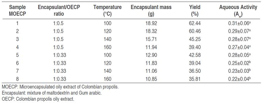 Table 1 lists the parameters used to describe the microencapsulation process using the Spray Dryer. Eight mixtures, two extract/encapsulant ratios, four temperatures, and two amounts of oily Colombian propolis extract (OECP) were used.