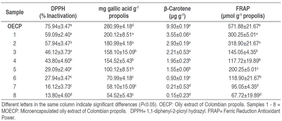 The microencapsulation of OECP enhances or preserves the activity of a sample against pro-oxidant substances and pathogens. Additionally, it allows the stable transport of active ingredients, such as gallic acid and beta-carotene, in a more reproducible manner. These results are important because MOECP could be preserved for much longer than in systems in which propolis was added without encapsulation. Furthermore, depending on the wall material and the optimal microencapsulation temperature/concentration ratio, the effective shelf-life of a bioactive can be extended. Microencapsulation of OECP using mixtures of maltodextrin and Gum arabic is possible, and more than 50% of the phenols and carotenoids in the raw sample are preserved.