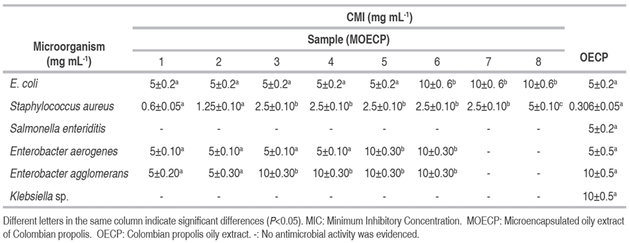 The MOECP activity against Salmonella enteritidis and Klebsiella sp. was null because the bioactive compounds that inhibit these bacterial strains were subjected to spray-drying and volatilization processes or other chemical reactions that altered their functional groups. In addition, the substances in the extract that do not undergo changes during encapsulation lack sufficient activity. This phenomenon was also evidenced -by MOECP activities against gram-positive and coliform organisms such as Escherichia coli and microorganisms of the Enterobacter genus, whose minimum inhibitory concentrations were higher than in OECP. In this study, the activity against gram-positive microorganisms such as Staphylococcus aureus was higher than that of other microparticles obtained from other propolis derivatives, such as ethanolic extracts (Da Cruz Almeida et al. 2017).