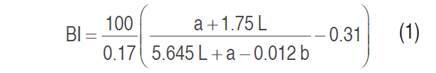 The colorimetry equipment (Konica Minolta, CM-5 spectrophotometer, Japan) was used with illuminant D65 and a viewing angle of 0° in reflectance mode, expressing the readings in terms of the CIELab color space (L*, a*, b*). Measurements were made of the values, where L represents luminosity (0 = black, 100 = white), a represents red/green (+ value = redness, - value = greenness), and b represents yellow/blue (+ value = yellowness, - value = blue). The Browning Index (BI) of the sauces was calculated using Equation 1 (S Abd El-Baset and Almoselhy 2023). The BI was used in order to measure how much the SFS increases the brown intensity as TF is added. No references were found with measurements of L*, a*, and b* of spicy fruit sauce; for this reason, the coloration was compared with three commercial samples of chili sauce.